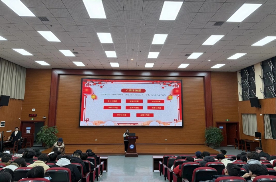 随后,会议进入表彰环节。经过前期评选与推荐,本次大会共评选出八类“十佳示范星”,以表彰在不同领域表现突出、具有鲜明示范作用的同学。有学习上进,勤学笃行的学习示范星虹津和李慧凤有进步明显,通过英语四六级,拿下校级专业竞赛一等奖的进步示范星峻宇同学还有拿下类奖学金且积极参加专业竞赛的能示范星鲁文莉同学