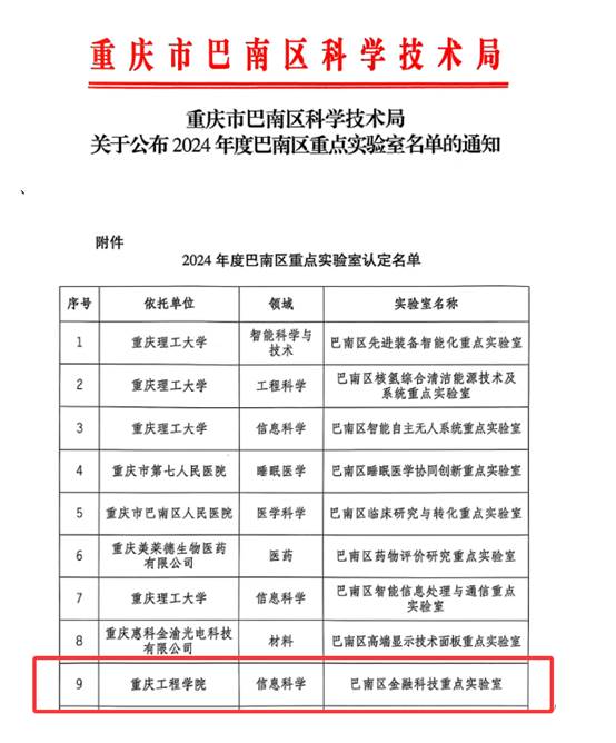 近日,巴南区科技局正式公布2024年度区级重点实验室立项名单。经过严格的形式审查、专家会议评审和实地考察等环节,最终确定“巴南区先进装备智能化重点实验室”等11个重点实验室获批立项。我校申报的“巴南区金融科技重点实验室”成功入选该名单。