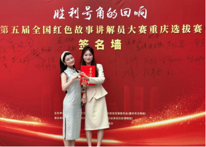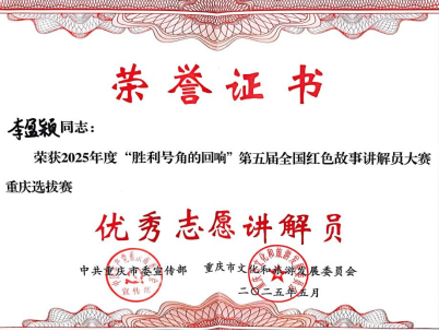 本次大赛由中共重庆市委宣传部、重庆市文化和旅游发展委员会联合主办,旨在通过红色故事讲解传承革命精神、培育社会主义核心价值观。大赛分专业讲解员和志愿讲解员两组,设置个人展示、自选讲解等环节,聚焦纪念中国人民抗日战争暨世界反法西斯战争胜利80周年,挖掘抗战故事中的民族精神。李盈颖同学在杨双溢老师的指导下,精心准备。比赛中紧扣主题,以充沛的情感和生动的表达,讲述了具有地域特色的红色故事,展现了扎实的讲解功底和对红色文化的深刻理解。