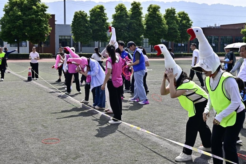 “迎面接力”“击鼓颠球”“欢乐套大鹅”“沙包投掷”“幸福毛毛虫”等趣味项目轮番上阵。老师们放下教案、走出办公室,在欢声笑语中协同配合。颠球时屏息凝神,毛毛虫竞速中步调一致,套圈传递间智慧频现。赛场变成欢乐的海洋,友谊与默契在互动中持续升温。