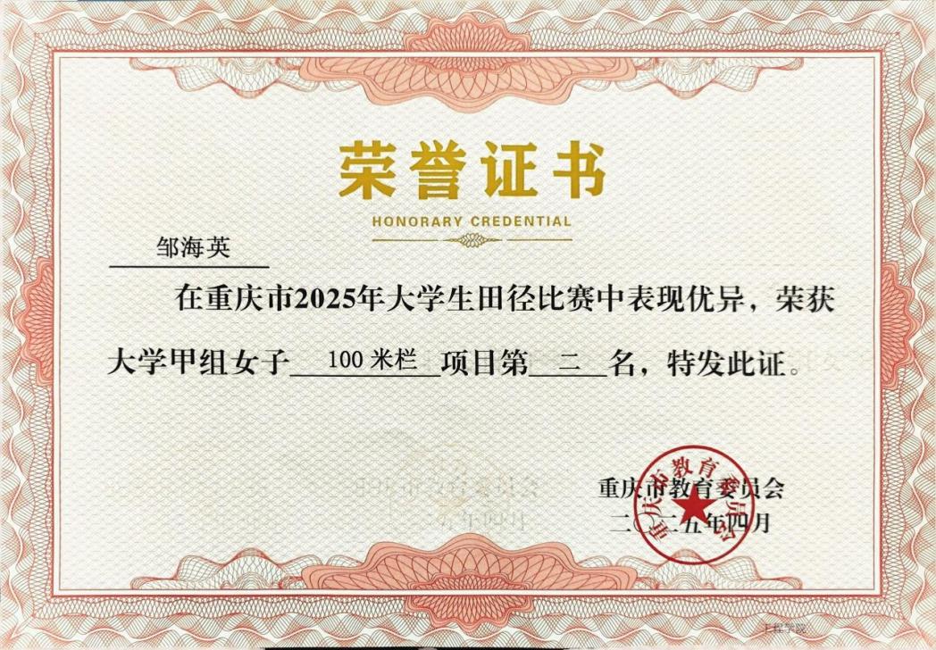 4月27日-30日,由重庆市教育委员会主办、西南大学承办的2025年重庆市大学生田径比赛在西南大学田径场举行。我校田径队展现了坚韧不拔的体育精神,8人荣获前八名、2人荣获体育道德风尚奖,是我校参加重庆市大学生田径比赛以来获得奖项最多的一年。