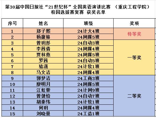 2025年5月14日14:30,“21世纪杯”全国英语演讲比赛重庆工程学院校赛复赛在双桥校区第一教学楼104教室顺利举行。经过激烈的竞争,最终推选出郑子熙和杨馥榕2名选手晋级川渝地区决赛。