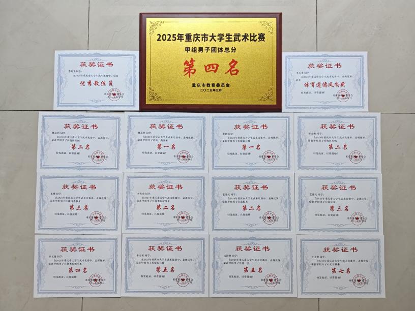 近日,由重庆市教育委员会主办、重庆师范大学承办的重庆市2025年大学生武术比赛在重庆师范大学落幕。我校武术队在此次赛事中表现亮眼,一举夺得第一名2项、第二名4项、第三名2项、第四名1项、第五名2项和第七名1项,荣获甲组男子团体总分第四名,李鹏飞老师被授予“优秀教练员”称号,刷新了我校在历届重庆市大学生武术比赛中团体总分、单项获奖人数及获奖次数的历史最佳成绩。