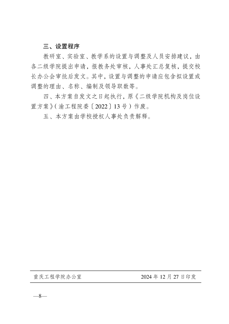 重庆工程学院二级教学单位机构及岗位设置方案(2024年修订)