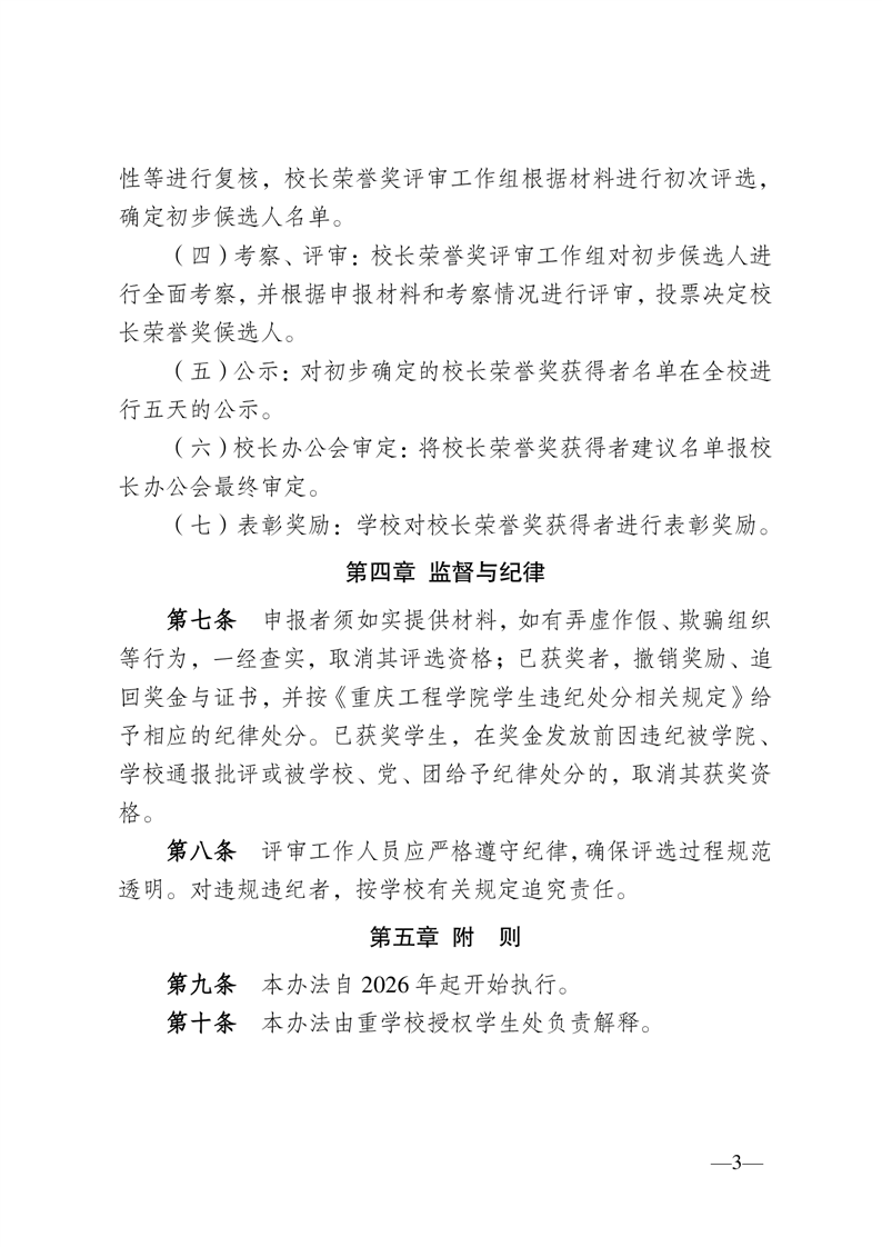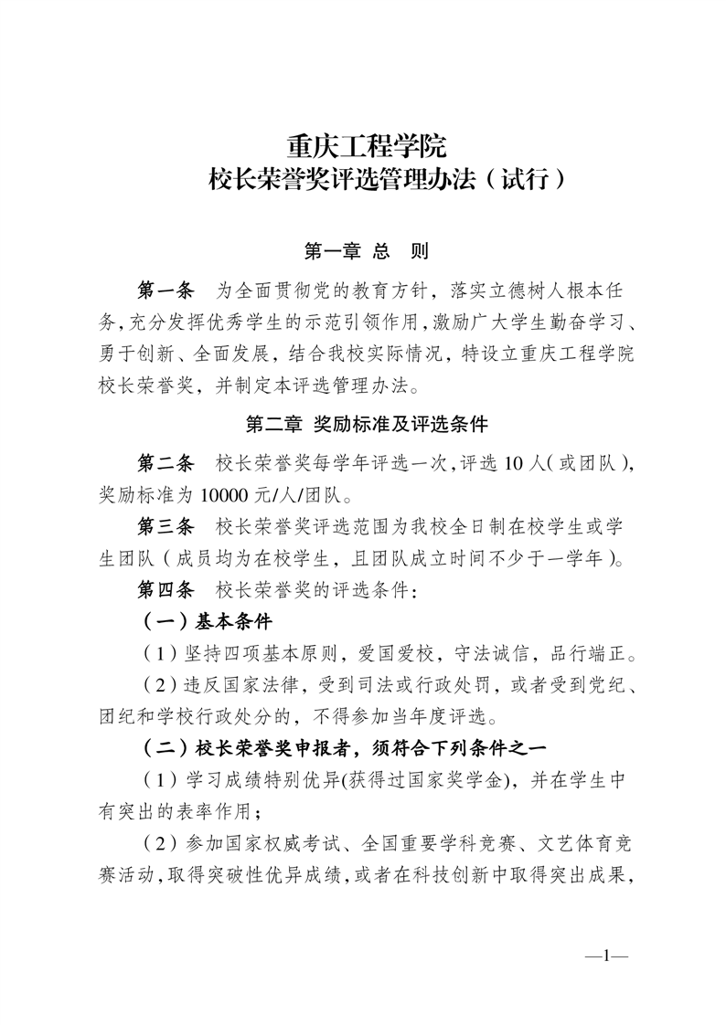 重庆工程学院校长荣誉奖评选管理办法(试行)