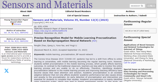 近日,我院赵鹏飞老师以第一作者身份在国际期刊《Sensors and Materials》 上发表了题为"Precise Recognition Model for Mobile Learning Procrastination Based on Backpropagation Neural Network”的高水平学术论文。