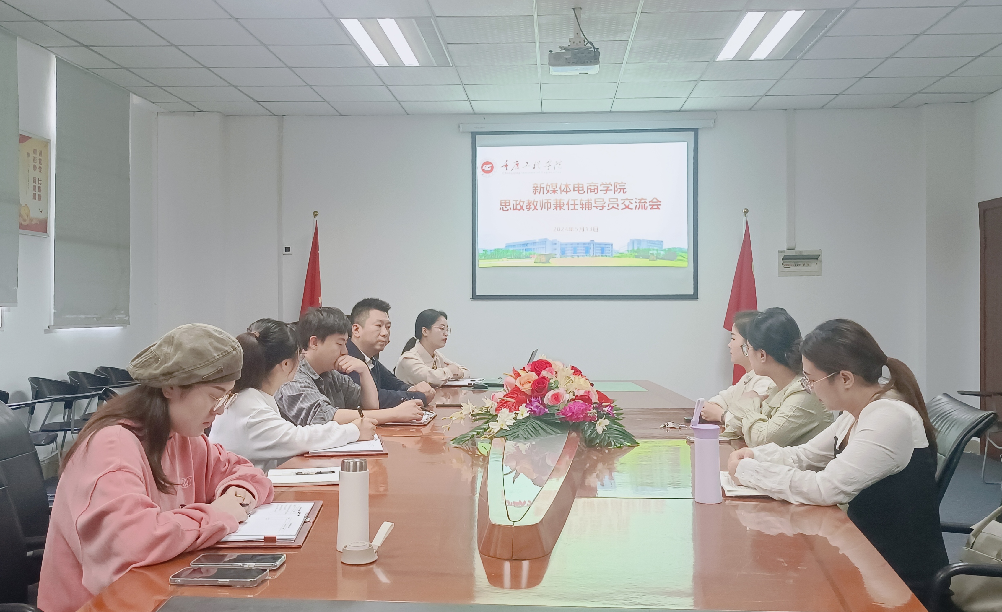 为更好落实立德树人根本任务,及时发现并解决学生的思想问题,实现思政理论教育与日常教育管理的有机衔接,新媒体电商学院于2024年5月13日上午9点在学院3104会议室开展了思想政治理论课教师兼任辅导员交流活动。新媒体电商学院党总支书记邹均、全体辅导员、马克思主义学院思政课教师兼任辅导员共同参与。