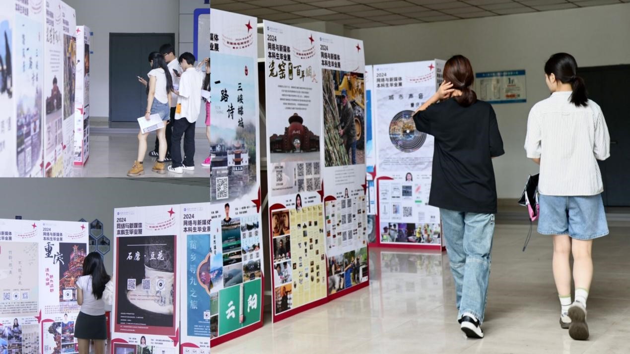 网媒专业的同学们自发前往第三教学楼广场参观网媒专业学生优秀作品联展