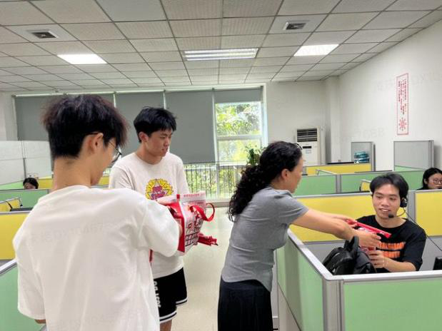 活动当天,基地美团客服团队精心策划,提前收集同学们的口味偏好和需求,确保每位同学第一时间收到可口饮品;学院校企合作美团项目负责人曾霞老师莅临基地,鼓励同学们好好学习,再接再励,并将关怀送到每一位同学手中。