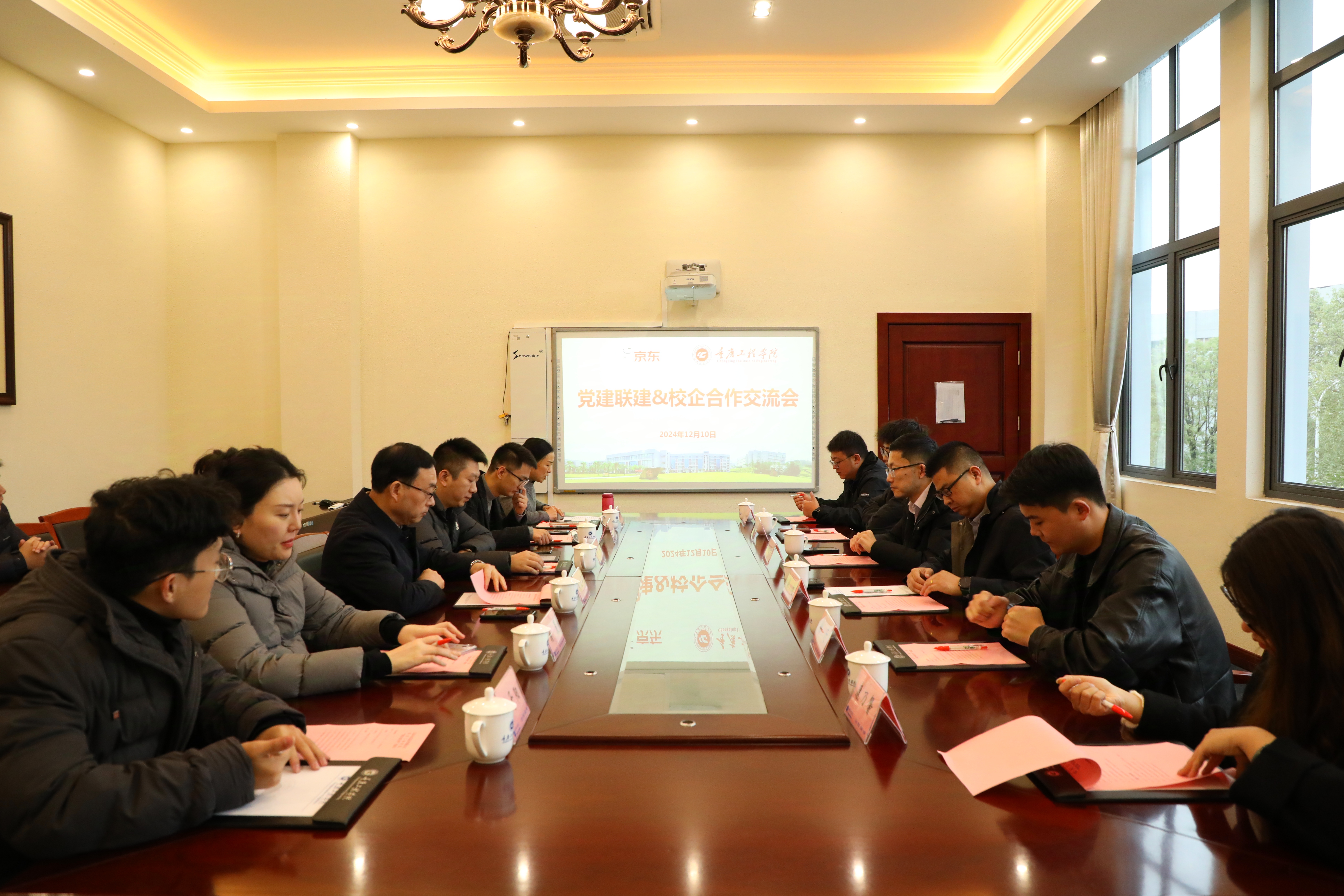 12月10日上午,重庆工程学院与江苏京东信息技术有限公司在学校南泉校区行政楼第六会议室举行“党建+ 校企合作”交流会。江苏京东信息技术有限公司众客服运营部负责人孙振宇、党委副书记、人才引进负责人徐旭以及校园战区有关负责人,学校党委副书记、常务副校长张业平、校长助理、新媒体电商学院党总支书记、院长邹均、电子商务系有关负责人等参加此次交流会。