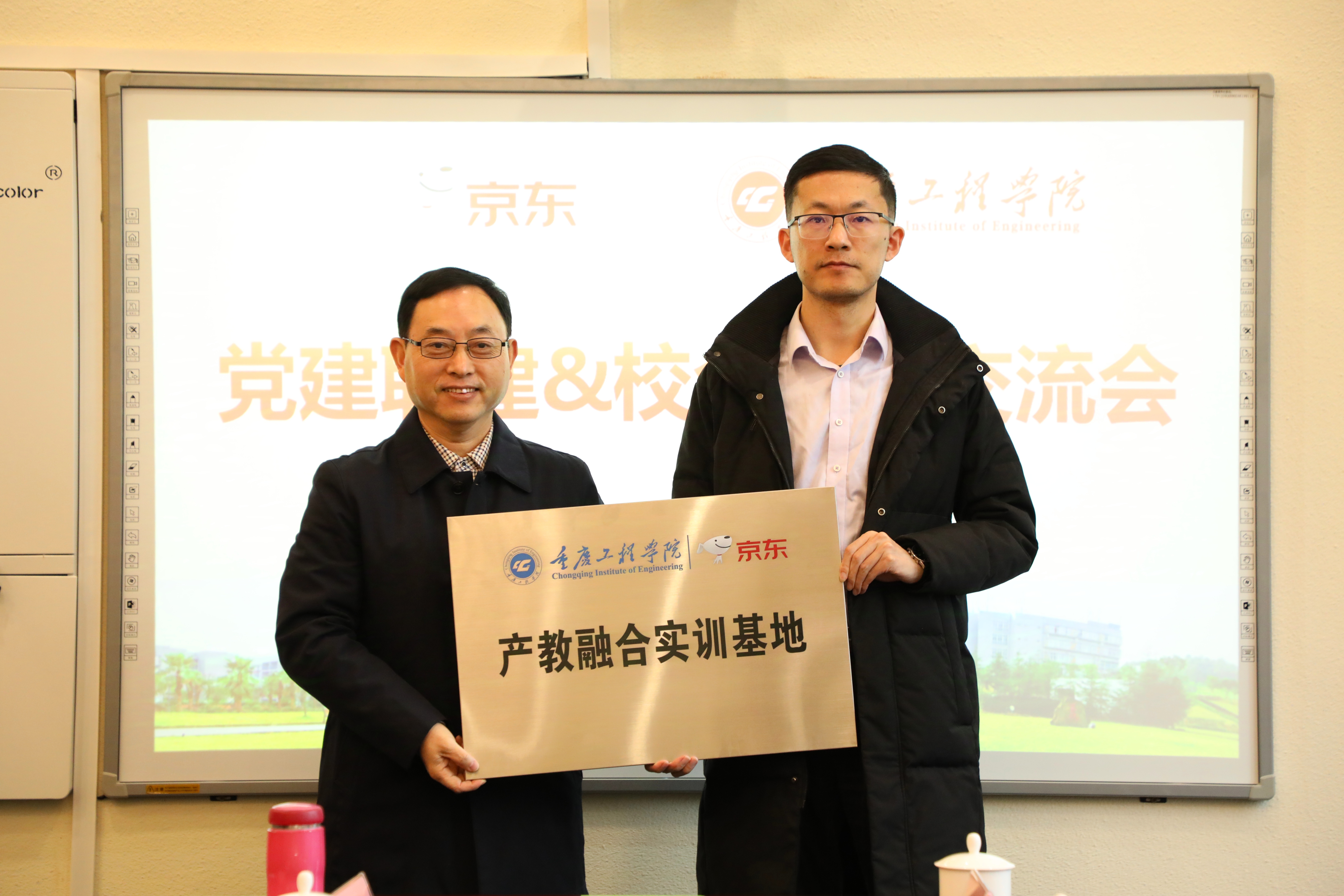 会上,江苏京东信息技术有限公司向学校授予了“产教融合实训基地”牌匾。