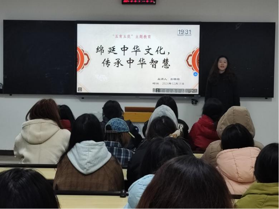 为弘扬中华文化的独特魅力和智慧,引导同学们深入理解中华文化的核心价值观和人文精神,增强文化认同感和自豪感。新媒体电商学院学生党员实践教育中心于12月18日在6111教室举办了“五育五促”主题教育系列活动第六期——“绵延中国文化,传承中华智慧”。