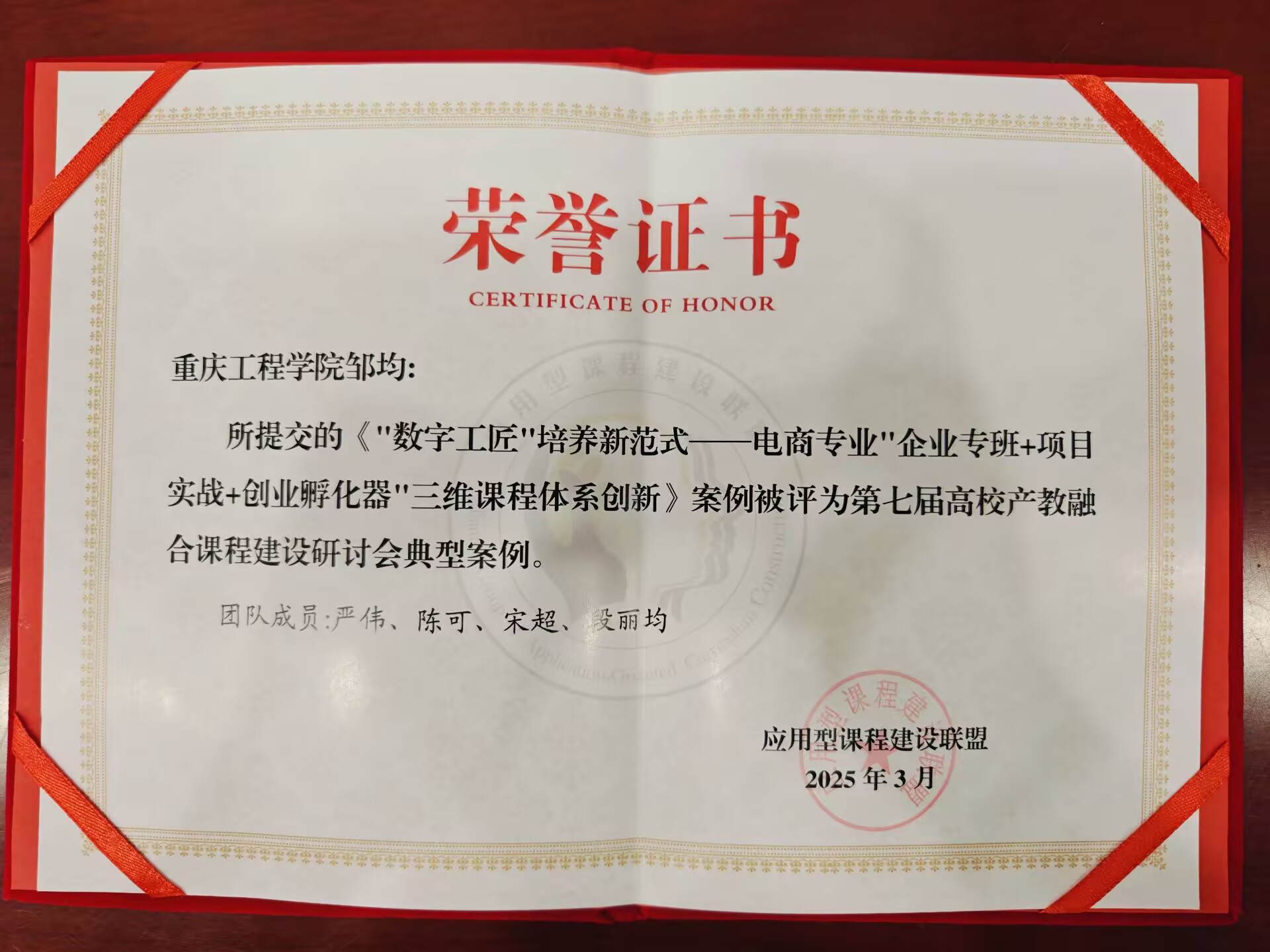 近日,由应用型课程建设联盟主办、海南科技职业大学协办的七届高校产教融合课程建设研讨会在三亚城市职业技术学院举行。教育部学校规划建设发展中心首席专家、重庆市教委原副主任牟延林、长春工业大学原校长张德江、齐齐哈尔工程学院创校校长、理事长曹勇安、教育部学校规划建设发展中心课程建设研究院秘书长张振笋等参加并作主题报告。我院《数字工匠培养新范式——电商专业企业专班+项目实战+创业孵化器三维课程体系创新》案例被评为第七届高校产教融合课程建设研讨会典型案例。