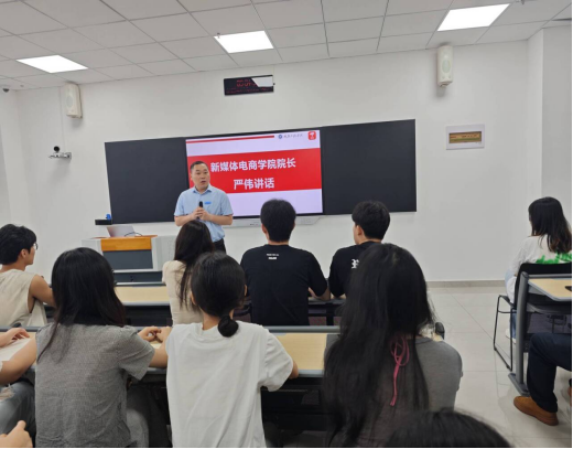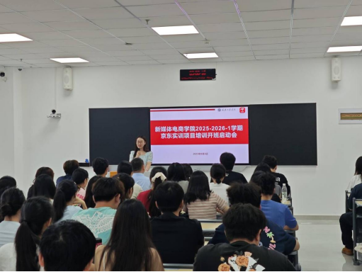 本网讯(文/图 项目办)9月3日,新媒体电商学院在双桥校区S3203教室召开2025秋季学期京东实训项目培训开班启动会。京东集团驻场运营主管储玲玲,学院院长严伟、京东实训项目负责人曾霞、24级电子商务专业辅导员谢媛,以及对应班组的实训指导教师、企业导师和24电商1-3班全体同学参会。