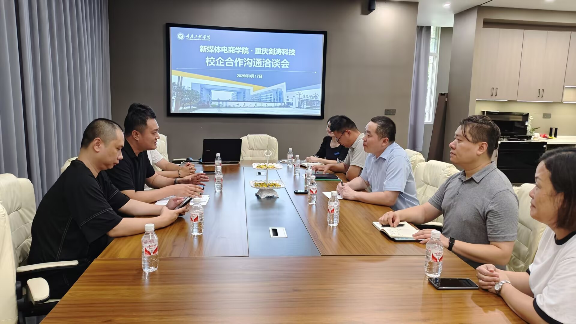 本网讯(文/图 就业科 杨睿)9月17日下午,新媒体电商学院迎来重庆剑涛物联网科技有限公司一行,双方就深化产教融合展开务实交流。学院副院长严伟、院长助理宋超、就业科副科长杨睿、项目办副主任燕霞等全程接待;剑涛物联党支部书记兼运营总监邓超、电商部门负责人欧宜泉经理、人力资源部负责人韩俊杰等企业代表参与活动,校企双方围绕人才培养与合作展开深入对接。