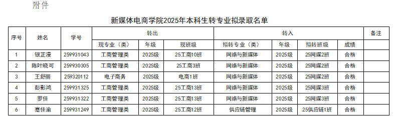 附件:新媒体电商学院2025年本科生转专业拟录取名单