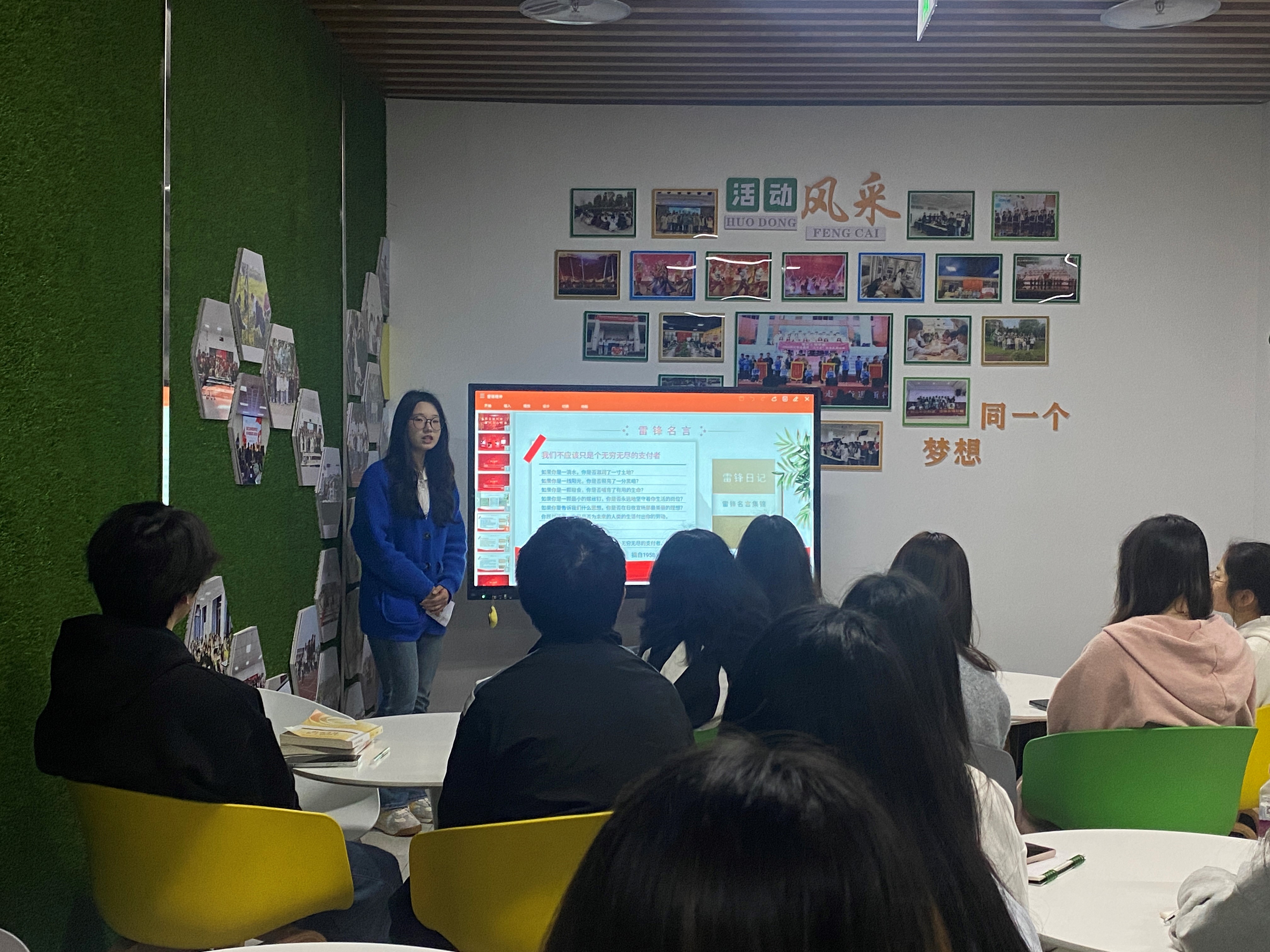 活动伊始,主讲人李懿临围绕雷锋事迹与雷锋日记展开宣讲,带领大家共同学习“人的生命是有限的,可是,为人民服务是无限的”等经典名言,深刻解读雷锋身上为人民服务的奉献精神、立足岗位的螺丝钉精神以及善于挤、善于钻的钉子精神,让同学们在文字与事迹中感悟榜样力量。