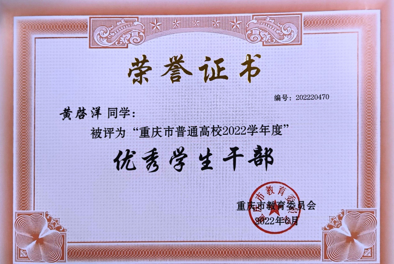 团学会、创新创业园、学生社团、一专一赛、花溪物业、大学生助理团等,都有黄啓洋奋斗的身影。他与同学们组建了“心理协会”,通过举办一系列特色活动,获得了校园五星社团的荣誉称号。大二进入南泉校区学习,他又加入了团学会和大学生助理团,还在学院办公室担任学生助理。大三时,他还担任了学院团委学生副书记,并获得了“重庆市优秀学生干部”称号……