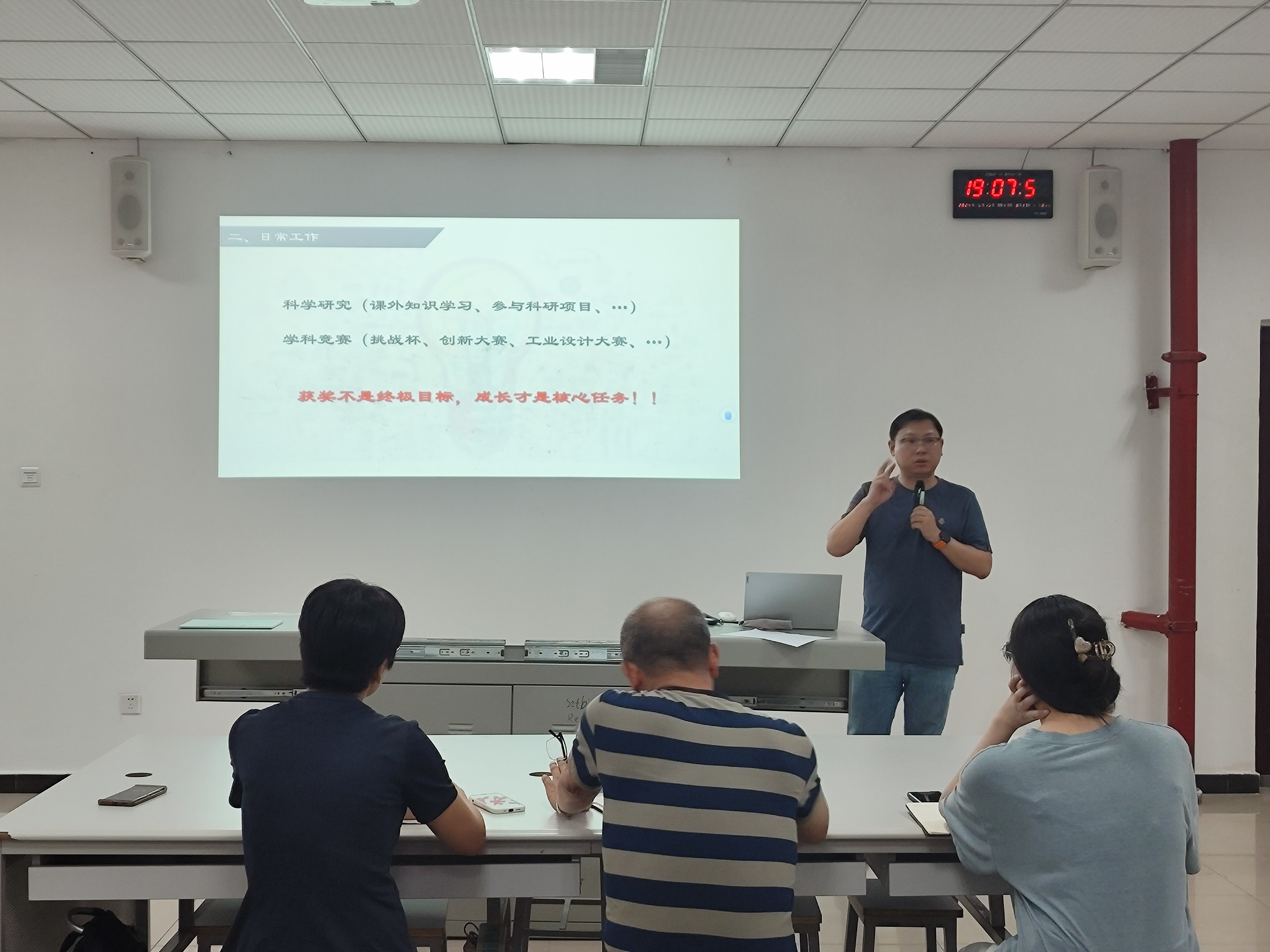会议开始,胡聪娟代表学院对加入创新中心的新同学表示欢迎,勉励大家勤奋努力,相互学习,在新的起点取得更大的成绩。随后学生代表黄冰杰对创新中心在科学研究与学科竞赛方面的工作进行了总结,回顾了过去一学期的工作学习历程,梳理了正反两方面的经验。紧接着,李洲荣对将来日常工作的开展及发展规划进行了详细讲解,他指出,科学研究和学科竞赛是创新中心的两大核心任务,要通过实践探索不断提升团队成员的专业技能和创新能力,鼓励大家要敢想敢做敢当,树立远大理想,制定明确计划,脚踏实地、勇于实践、不畏艰难、敢于担当。最后,指导老师申爱民教授也以科技创新为主题进行了激情演讲,他指出创新中心不仅是技术探索的前沿阵地,更是培养未来科技人才的摇篮,希望每位成员都能在这里找到属于自己的舞台,勇敢追梦、不懈奋斗。
