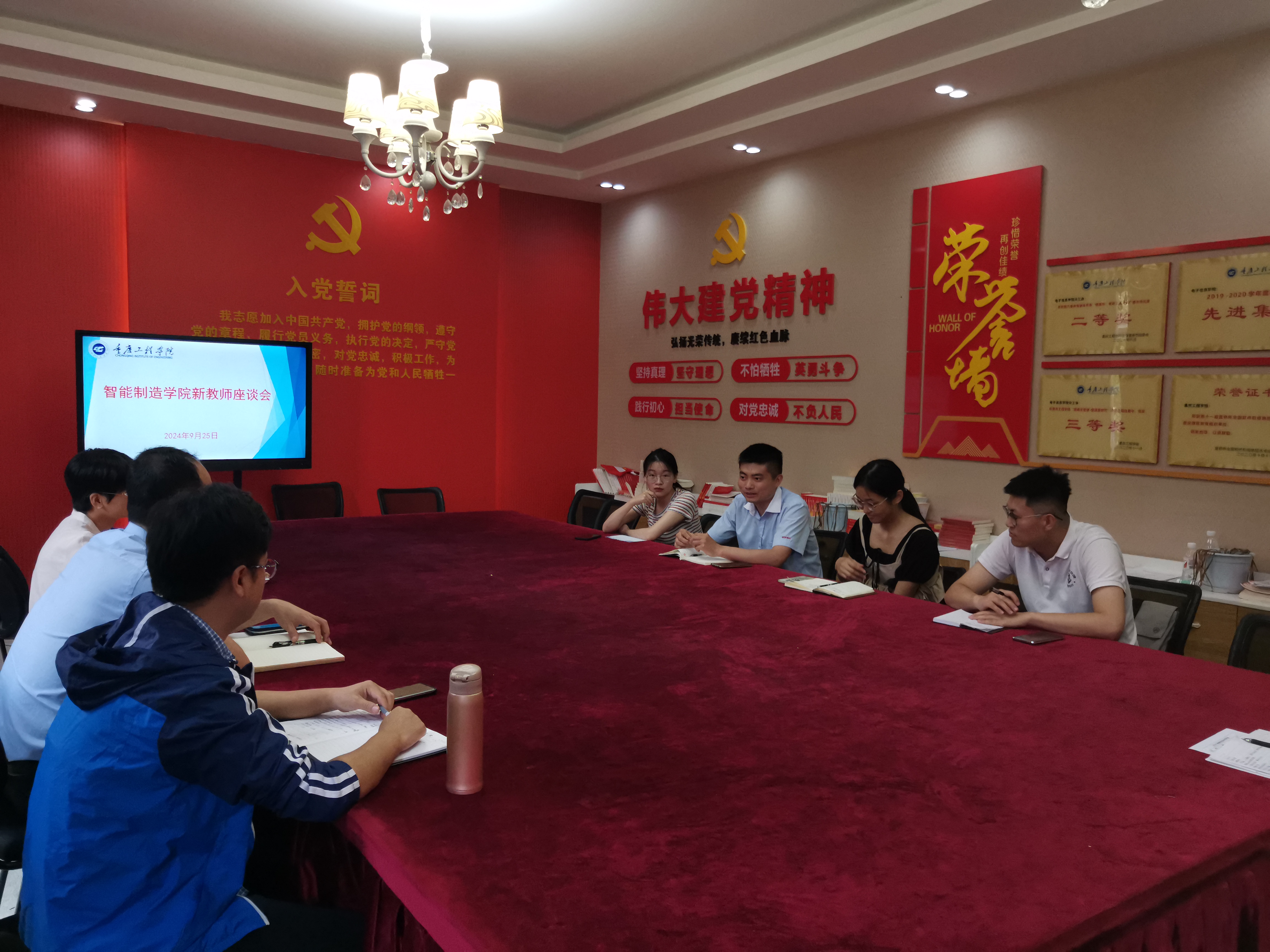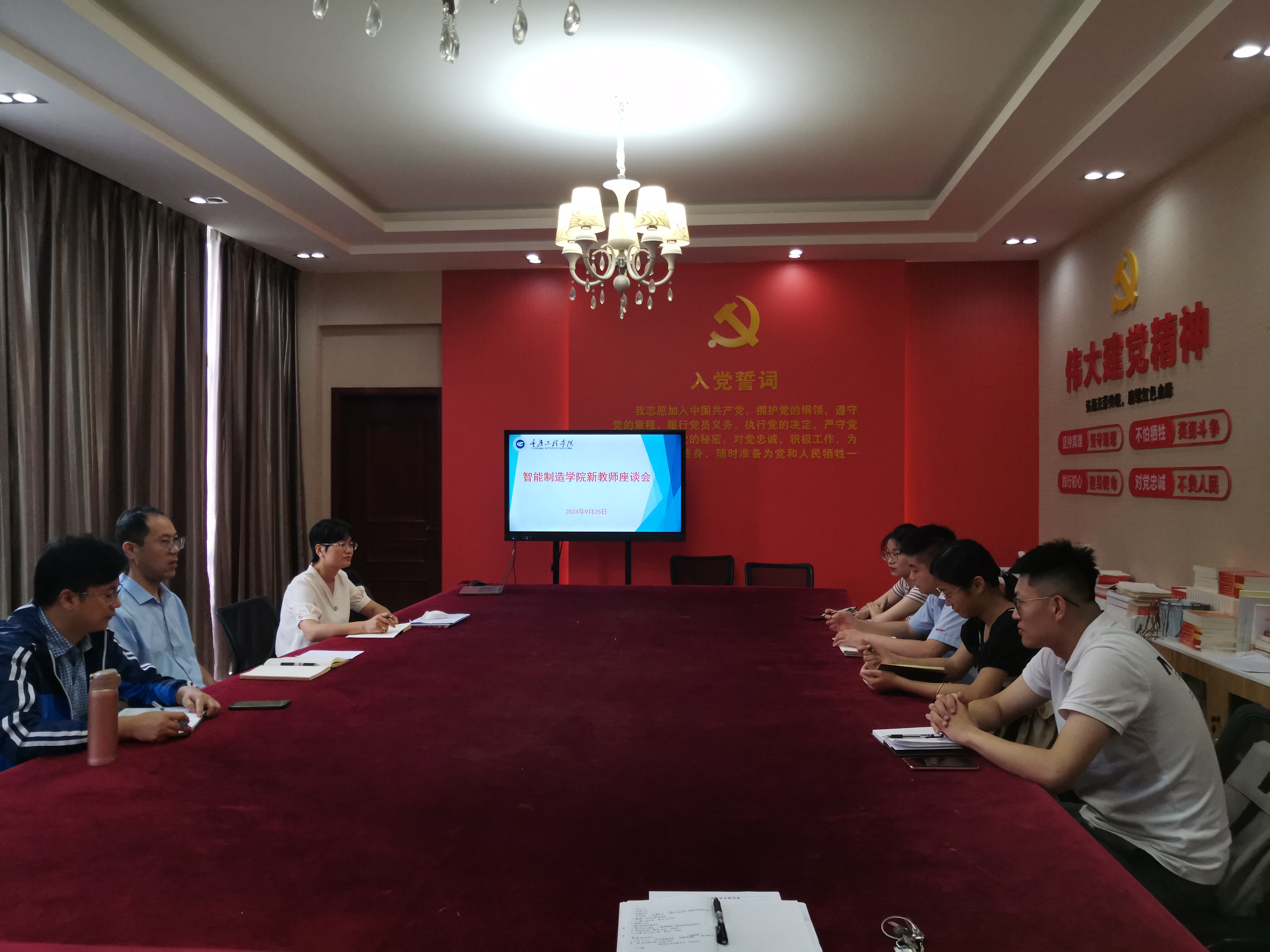 为进一步了解新教师工作生活情况,帮助新教师在新的岗位尽快转变角色,9月25日下午,智能制造学院在办公楼二楼会议室召开新教师座谈会。会议由学院副院长陈成瑞主持,院长助理胡聪娟、自动化系副主任蒋云国、教学秘书陈白银霜以及全体新教师参加。