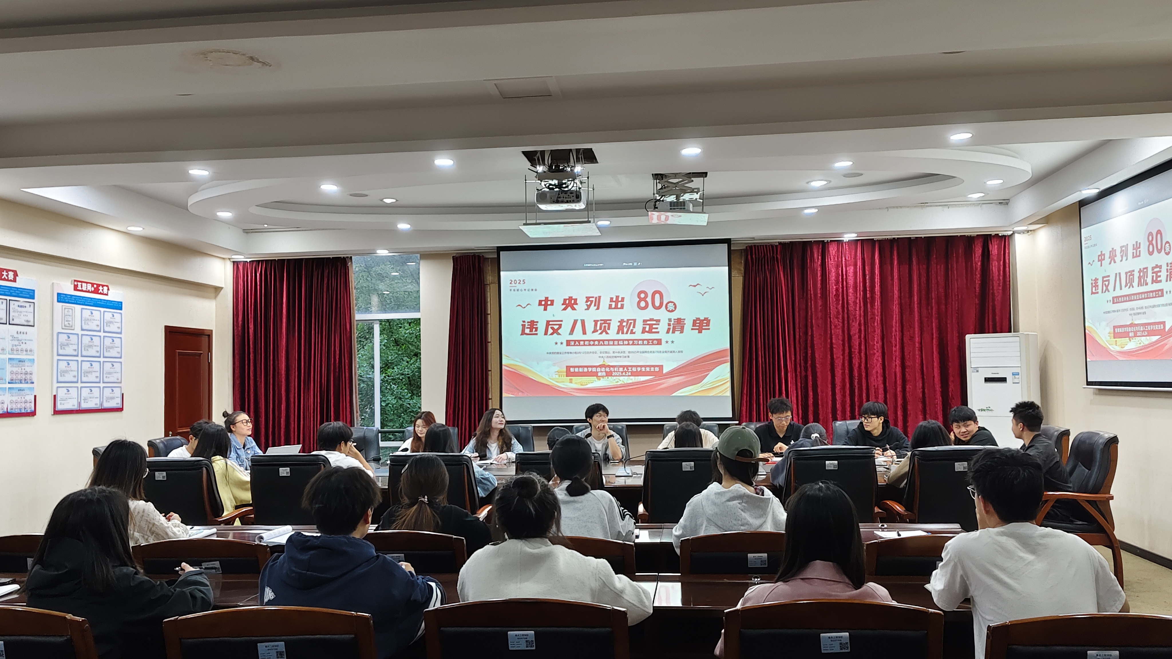 为强化学生党员的纪律意识与廉洁观念,推动党风廉政建设在青年党员群体中扎根。4月24日,智能制造学院自动化与机器人工程学生党支部在办公楼212会议室开展以“深悟八项规定精神,严守纪律作风红线”为主题的党课学习活动。此次党课由支部书记谢燕主讲,支部全体党员同志及发展对象参与。