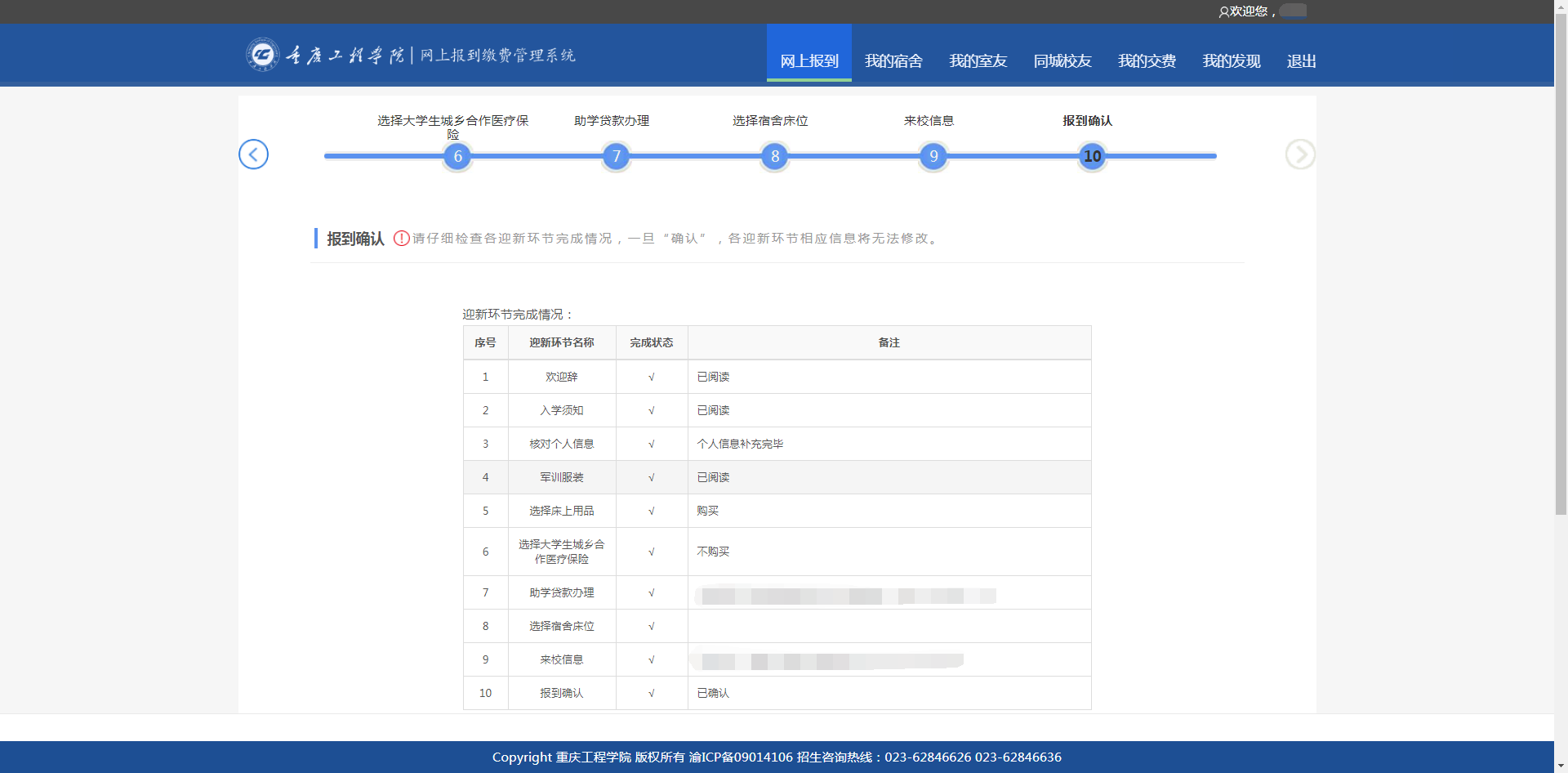 2.进入报到确认环节,请务必仔细检查每个环节的办理结果是否准确(若发现错误的办理结果,请及时修改),一旦点击“确认”按钮,每个环节的办理结果进行锁定,无法进行修改。