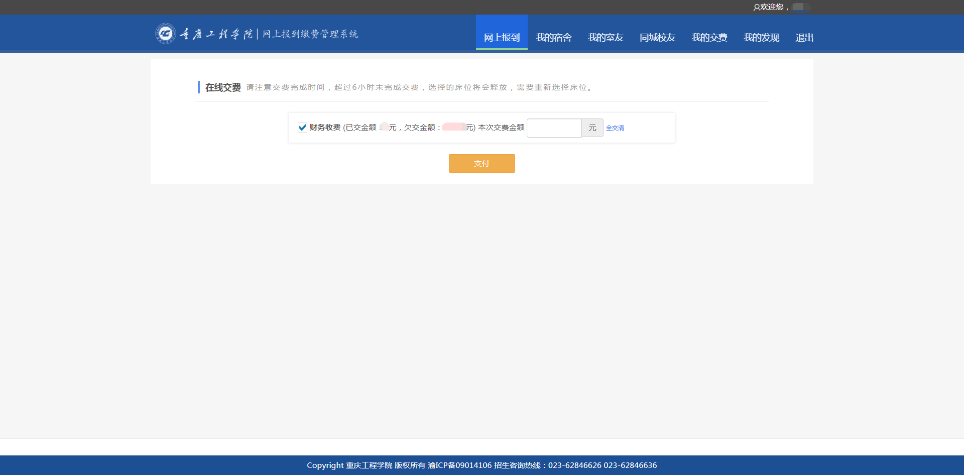 2.首先新生阅读欢迎辞和入学须知,然后依次完成个人信息核对、军训服装购买、床上用品选购、大学生城乡合作医疗保险购买、助学贷款金额、选择宿舍及床位、来校信息、报到信息确认等迎新环节,即可完成网上注册报到。在报到确认页面点击“在线支付”按钮进入在线交费界面进行缴费。网上缴学费目前支持三峡付支付、微信支付、支付宝支付、银行卡支付,支付方式多,安全便捷。