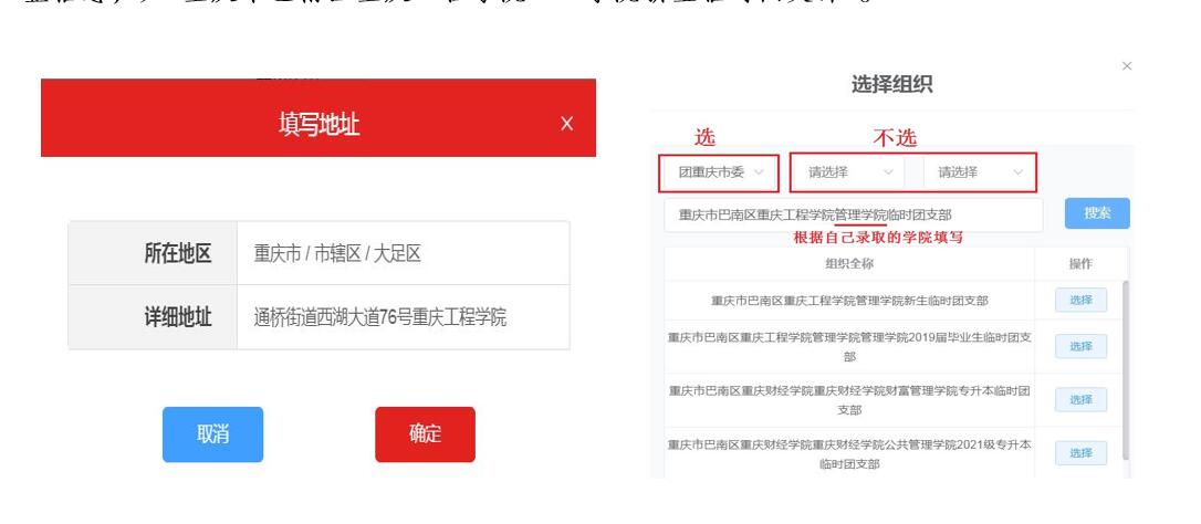 注:在“新学校所在地详细地址”是填大一新生就读的大足双桥校区的地址,而“申请转入组织”需要填写学校巴南南泉校区相关二级学院信息。智慧团建系统内具体选择学校区域时只选择第一个“团重庆市委”,后面两个均不用选择,下方组织全称搜索时需输入学校完整信息,如“重庆市巴南区重庆工程学院XX学院新生临时团支部”。