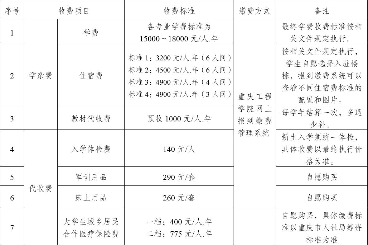 1.入学体检费:根据重庆市教委的相关规定,所有新生入学报到后、学籍注册前由学校统一安排体检,入学体检费140元/人,具体收费以最终执行价格为准。