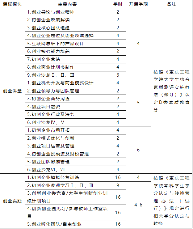 3.学员每学期完成创业实践环节训练后,可按照《重庆工程学院本科学生学分认定与转换管理办法(修订)》规定申请学分认定与转换,由创新创业学院确认后报教务处审定。