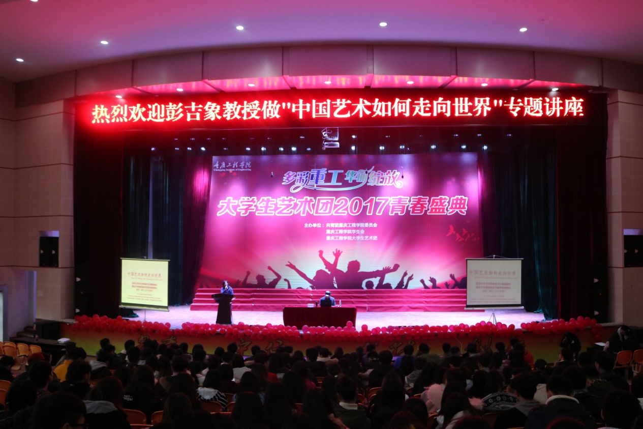 活动邀请重庆大学美视电影学院常务副院长彭吉象教授,彭教授用现代的艺术语言体现中国的优秀传统文化,分别从电影人物、动漫、绘画、建筑、舞蹈、音乐、文学、等多个邻域讲述了中国艺术史走向世界的历程。