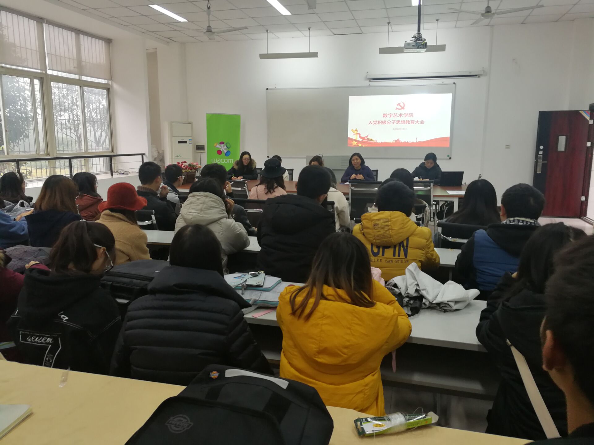 党总支书记徐小辉进行了明确入党动机、党的方针、政策等一系列讲话,并指明习近平新时代中国特色社会主义思想是每一个青年学生理论学习必修课,入党积极分子应该全文学习十九大精神和党章,在学习中深刻了解党的最高理想与奋斗目标,找到前进的动力,为积极向党组织靠拢而努力奋斗。随后,第一支部书记陈遥向大家传达《数字艺术学院学生党员发展考核细则(试行)》,并对其进行了详细的讲解,告诫各位入党积极分子时刻以党员标准严格要求自己,主动向党组织汇报。最后,党总支组织委员周静,就学生党员的思想情况及主动性进行讲话,告诫学生们一步一个脚印,机会是留给有准备的人。
