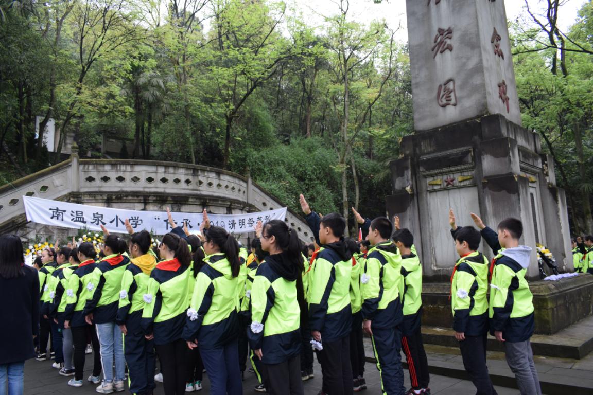 为弘扬爱国主义,培养家国情怀,缅怀为了祖国解放和人民安宁而英勇牺牲的烈士,瞻仰他们的丰功伟绩。2019年4月4日,南温泉小学举办了南温泉小学师生及家长“传承▪2019清明祭英烈”活动。在此,南温泉小学六年级全体成员及重庆工程学院数字艺术学院学生第一党支部志愿者怀着沉重的心情向所有牺牲的烈士敬礼、深鞠躬。