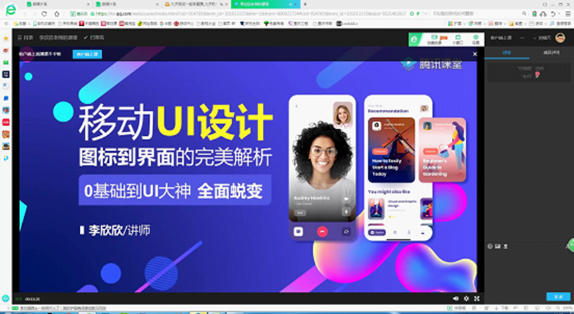 李欣欣老师承担软件学院17级本科前端1班的《移动UI设计》,在腾讯课堂平台进行直播,跟学生互动情况良好,教师准备充分,教学PPT准备精致,向同学系统介绍的了本学期的学习任务以及学习内容。