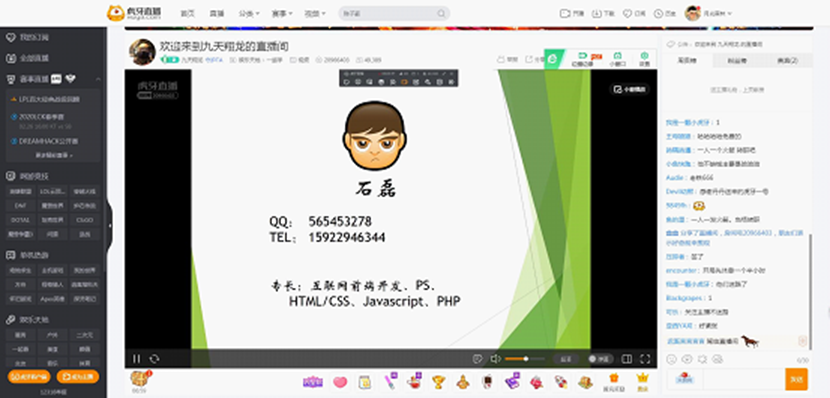 石磊老师承担数字艺术学院数字媒体技术17级本科前端1、2、3班的《客户端编程技术》,在虎牙直播平台进行直播。老师跟学生互动情况良好,学生积极使用弹幕跟教师进行沟通。教师准备充分,教学PPT准备精致,通过丰富而有趣的案例向同学们系统介绍的了本学期的学习任务以及学习内容,并对互联网整体行业进行了解析。