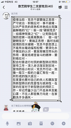 为深入贯彻习近平总书记关于疫情防控重要讲话指示精神,全民战役,2020年2月28日13:00,重庆工程学院数字艺术学院学生第二党支部开展了2月主题党日活动,参与人员包括全体党员及预备党员。