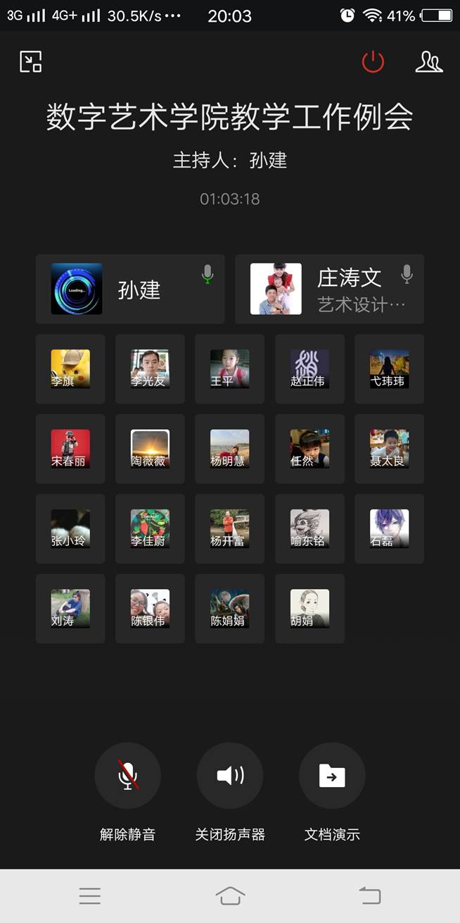 2020年3月20日下午,数字艺术学院通过网络电话会议形式组织召开了2019-2020学年第二学期第二次教学工作例会。会议由办公室主任孙建主持,杨开富院长、庄涛文副院长、各系教学督导、正副主任、教研组长和综合办公室相关人员参加了本次会议。