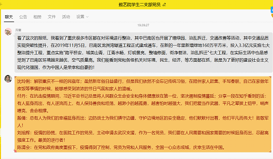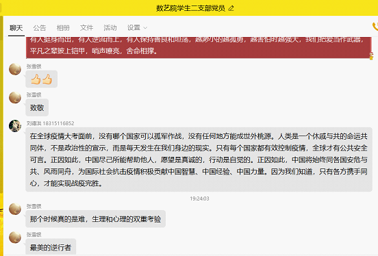 为使我院党员同志充分认识新形势下读报学习的重要性,提高“重知识,勤学习”的意识,养成良好的读报习惯。2020年5月29日19:00,数字艺术学院学生第二党支部在QQ群课堂组织开展了以“读报分享”为主题的党日活动。本次分享会由学生党员李元琼主持,学生第二党支部书记张雪银,预备党员、党员共32人参与。