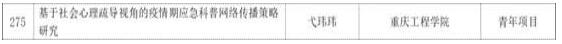 本网讯(文/刘益明)近日,经专家评审,市社科联审核,并报市委宣传部批准,现2020年度重庆市社会科学规划项目立项名单已经公布。其中,我院弋玮玮老师的《基于社会心理疏导视角的疫情期应急科普网络传播策略研究》项目在2020年度重庆市社会科学规划青年项目中成功立项。