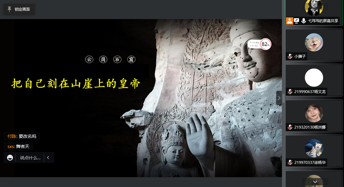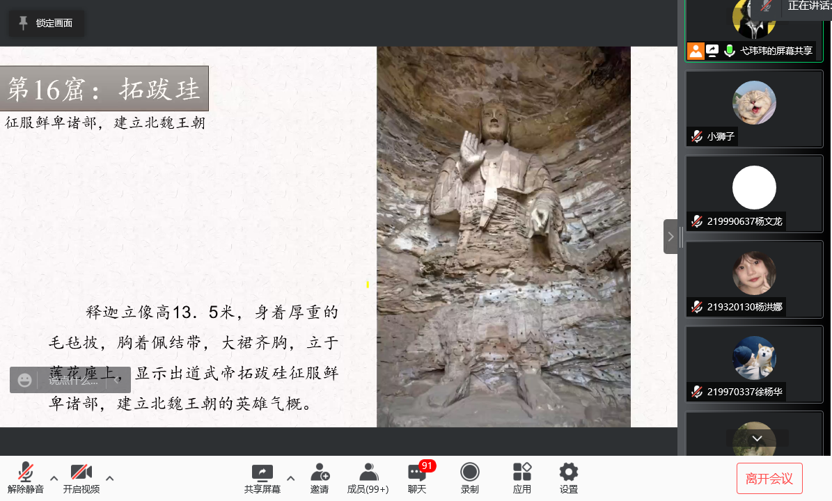 讲座中弋玮玮老师讲解了拓跋家族修建昙曜五窟的经过,先后对十六至二十窟大佛进行详细的介绍,再结合当时社会背景不同皇帝在位时社会经济形态及文化条件的不同,最后昙曜五窟各窟大佛形态各异,反映出不同社会文化,同时为学生们普及了北魏石窟艺术。