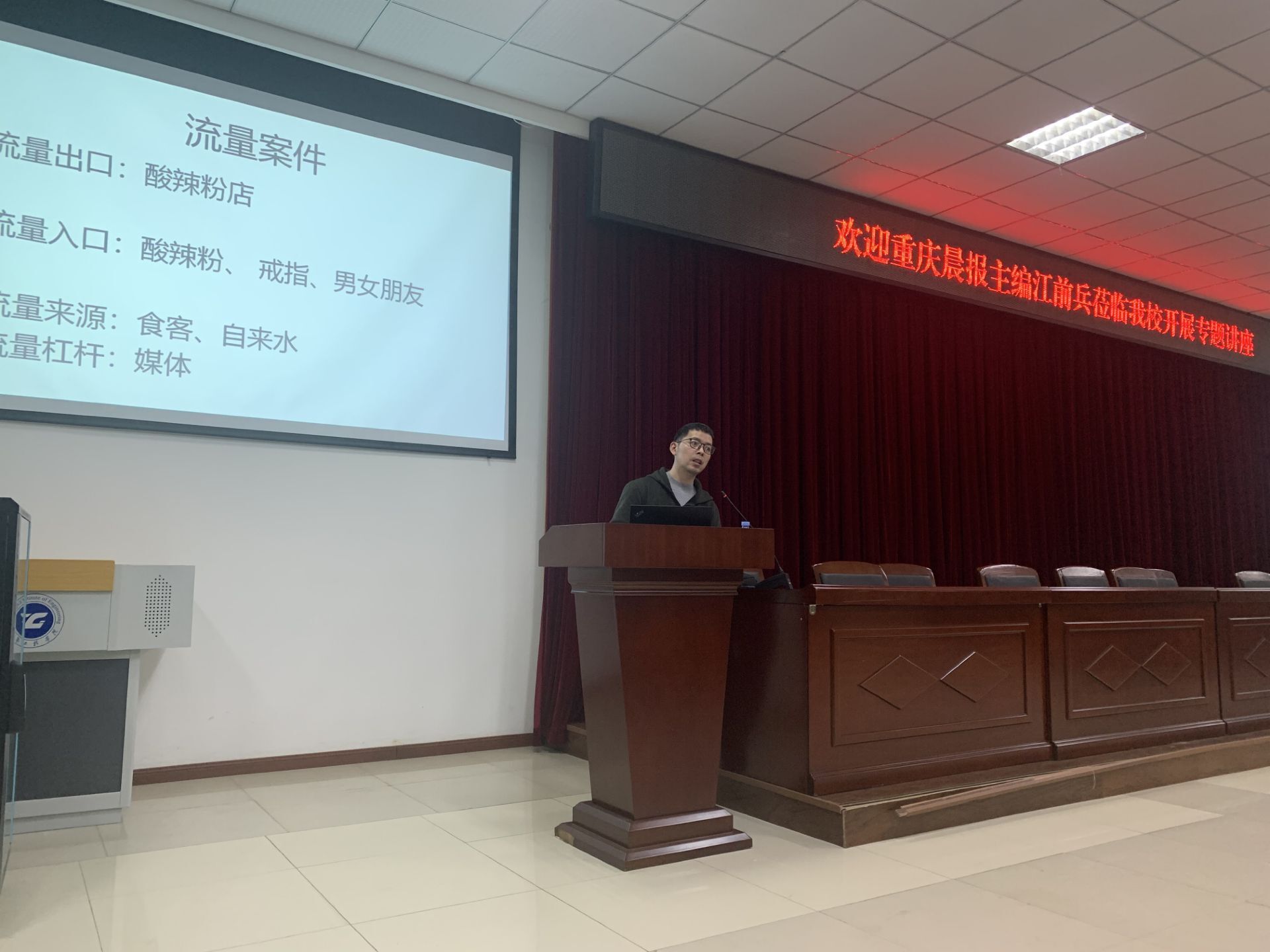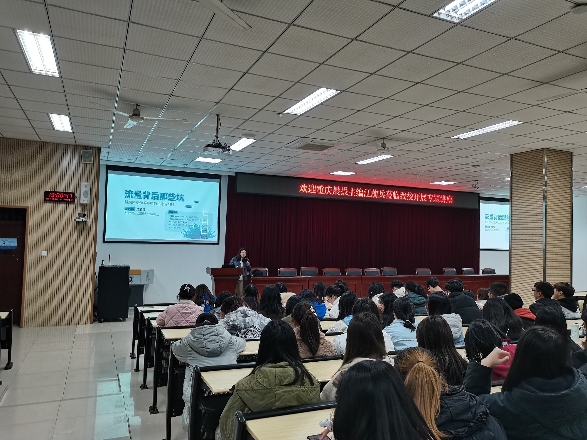 2021年12月6日,数字艺术学院“流量背后那些坑”专题讲座在六教302举办,该讲座由数字艺术学院新媒体系承办并由专业老师刘娉主持,重庆晨报主编江前兵主讲,共300余名师生代表参会聆听。