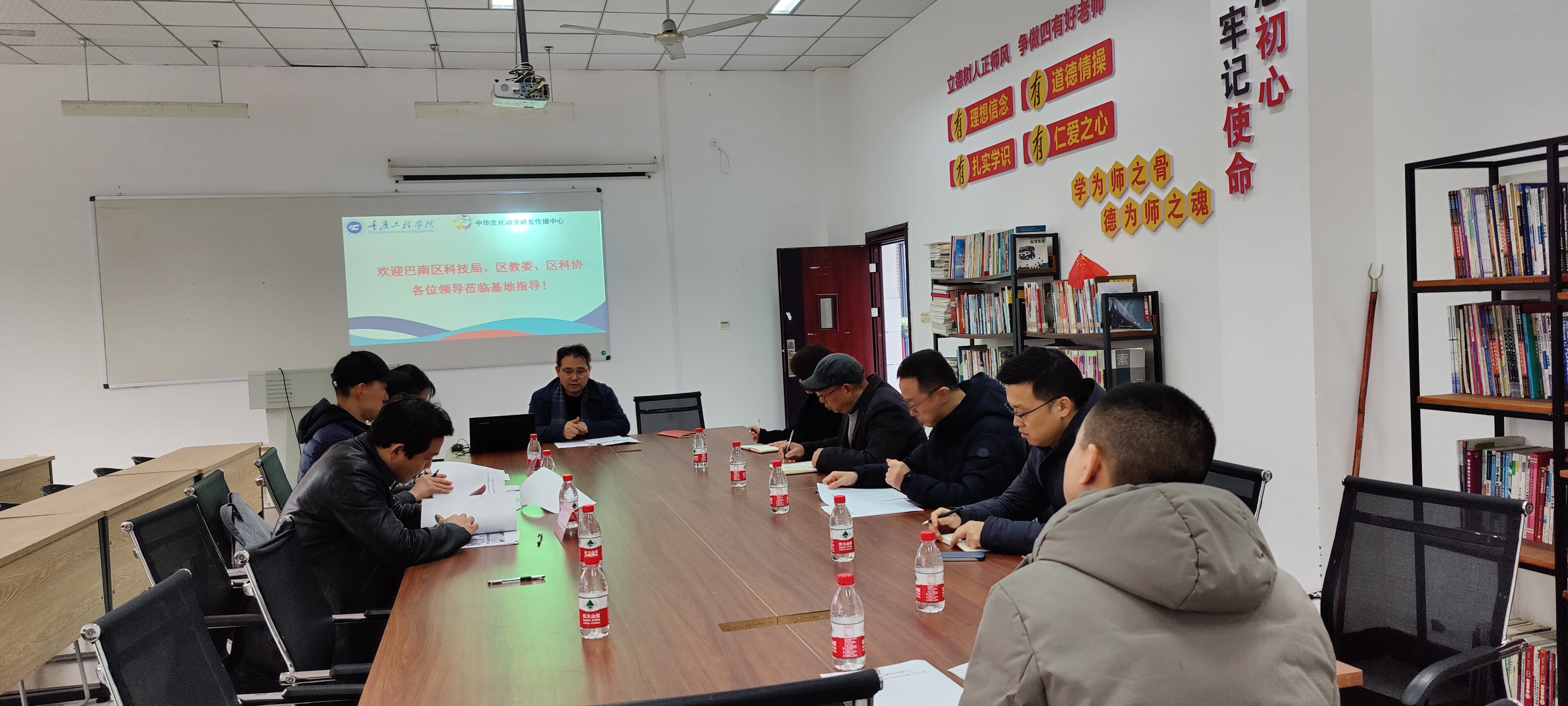 2022年2月24日10时许,重庆市巴南区科技局梁朋、区教委罗智勇、区科协夏荣霞等领导专家莅临重庆工程学院中华文化动漫研发中心指导科普基地建设工作。