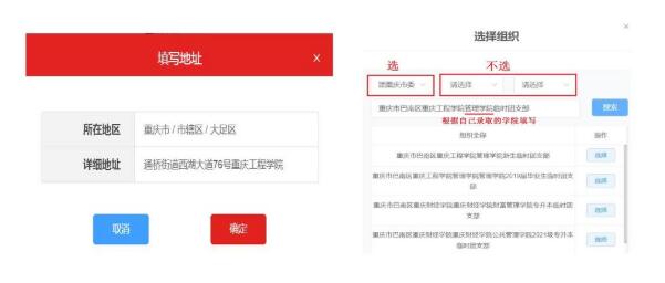 注:在“新学校所在地详细地址”是填大一新生就读的大足双桥校区的地址,而“申请转入组织”需要填写学校巴南南泉校区相关二级学院信息。智慧团建系统内具体选择学校区域时只选择第一个“团重庆市委”,后面两个均不用选择,下方组织全称搜索时需输入学校完整信息,如“重庆市巴南区重庆工程学院XX学院新生临时团支部”。