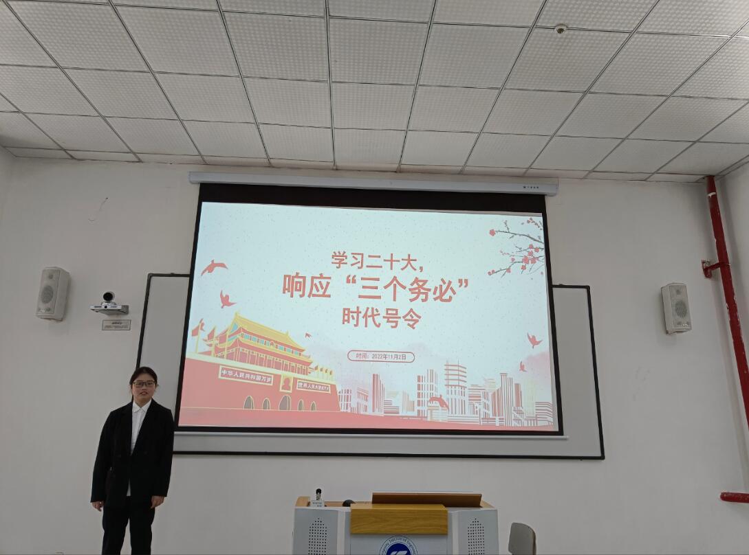 熊欢同志从学习二十大,响应“三个务必”时代号令进行领学,讲从“两个务必”到”三个务必”在新时代的重要意义。贺靖杰同志则以“肩负新时代新征程党的使命任务”为主题,从学习宣传和全面贯彻落实党的二十大精神和党中央决策部署,是当前和今后一个时期全党全国的首要政治任务为切入点,讲述新时代党的使命任务。王熙萌同志从“踔厉奋发新时代 勇毅前行新征程”学习贯彻党的二十大精神进行领学,对党的二十大报告中,总书记对青年和青年工作的重要阐述,进行细致学习。学习结束后全体同学结合本次学习内容交流心得,分享感悟。