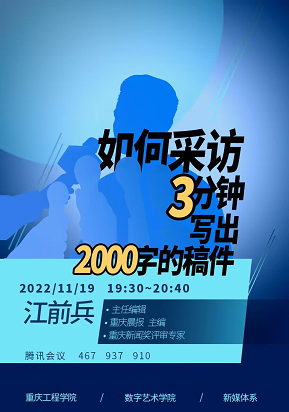 本网讯(图/文 数字艺术学院 罗雪凤)为加强网络与新媒体专业学生的采访写作能力,提升新闻素养,11月19日晚19时30分,网络与新媒体系举办了主题为“如何采访3分钟写出2000字稿件”的线上讲座。本次讲座特邀重庆晨报主编江前兵,就新闻采访和快速写稿等技巧向同学们作了详细指导,网络与新媒体专业全体学生共同参加。