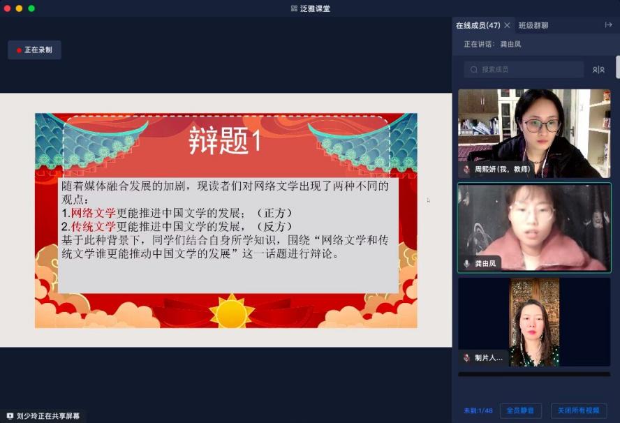 《网络文学》是数字艺术学院网络与新媒体专业的一门专业核心课程,本次课程辩论赛以20级网媒1、2、5、6班为专家试点,结合本学期的知识内容与热门学术话题确定辩论命题,秉承“以学生为中心”的教学理念,由学生自主制定比赛规则及具体流程,并参与辩论。学生在此次课程辩论赛中表现积极主动,对专家评委进课堂和辩论赛这样的新形式非常认可和喜爱。学生们充分发挥了团队及自我优势,辩论过程中辩手旁征博引、妙语连珠,团队之间配合默契;赛场氛围紧张激烈,双方选手你来我往,侃侃而谈;自由辩手也反应热烈,纷纷表示希望可以再次举办类似活动。每组辩论赛后,以彭玉沨老师、周莹冰老师为主的专家评委发挥榜样力量,针对辩手现场表现进行精彩点评,指出选手论辩的优缺点,并传授相应的辩论技巧,使学生们受益匪浅。本次课程实践在专家带动、教师辅助的合力之下,很好实现“专家进课堂,精准指导促提升”的目的。