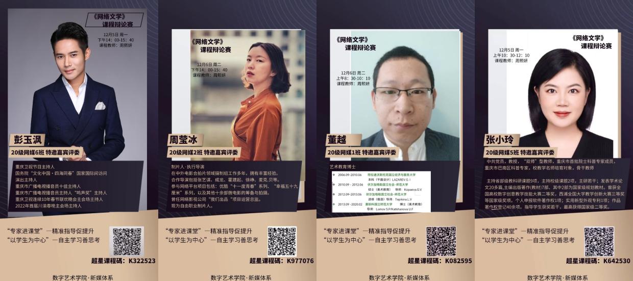 本次课程辩论赛特别邀请到了两位校外行业专家与两位校内学术专家一并担任嘉宾评委。其中,嘉宾评委彭玉沨老师是重庆卫视著名的节目主持人,也是国务院“文化中国·四海同春”国家国际间访问演出主持人,重庆市广播电视十佳主持人,“鸣声奖”得主;嘉宾评委周莹冰老师则拥有多年中外电影摄制经验,曾多次与张艺谋、成龙、徐峥、麦克·贝等著名导演合作,参与优酷“十一度青春”系列、“幸福五十九厘米”系列等十余部微电影筹备与拍摄的执行导演、自由职业制片人。嘉宾评委通过线上教学平台全程参与指导,并对辩手表现、辩论稿内容和团队配合度等进行打分。