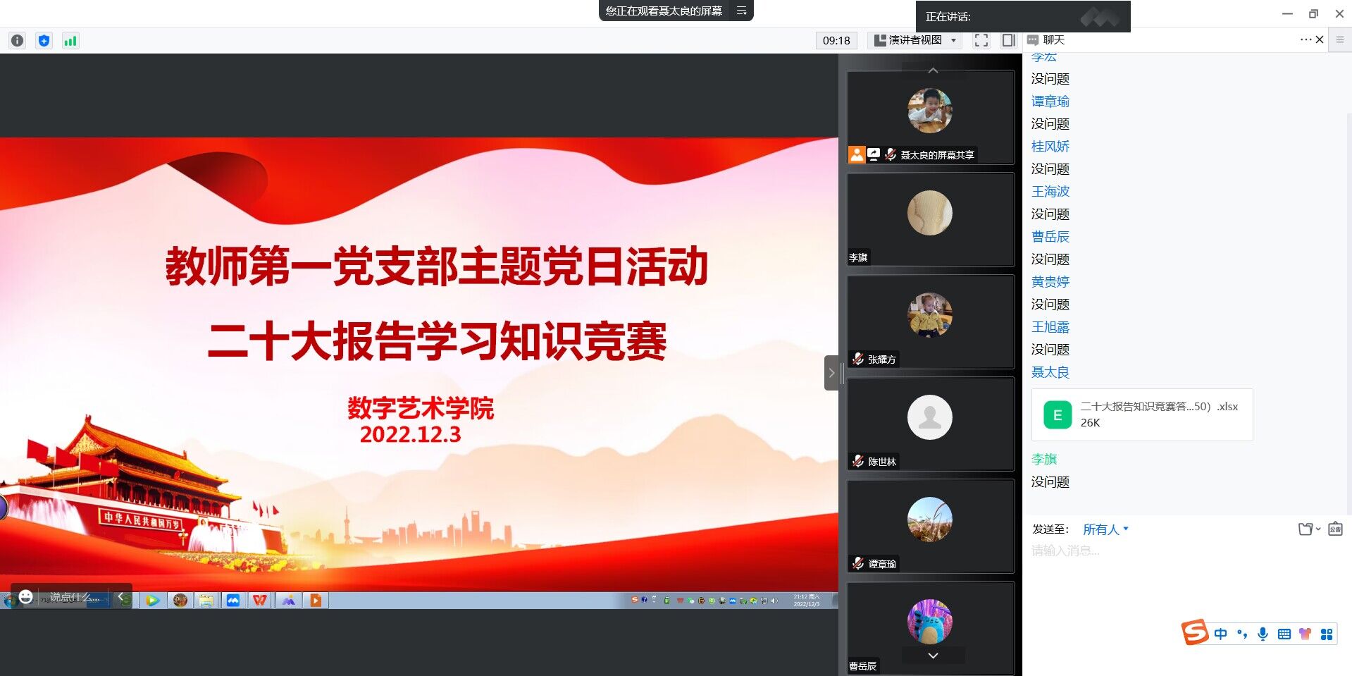 本网讯(图/李旗 文/李旗) 2022年12月3日晚上9点,数字艺术学院教师第一党支部开展线上“深入学习贯彻党的二十大报告精神”主题党日活动,活动由聂太良书记主持,全体党员参加活动。