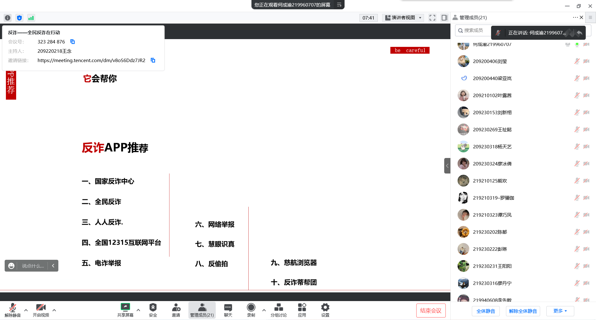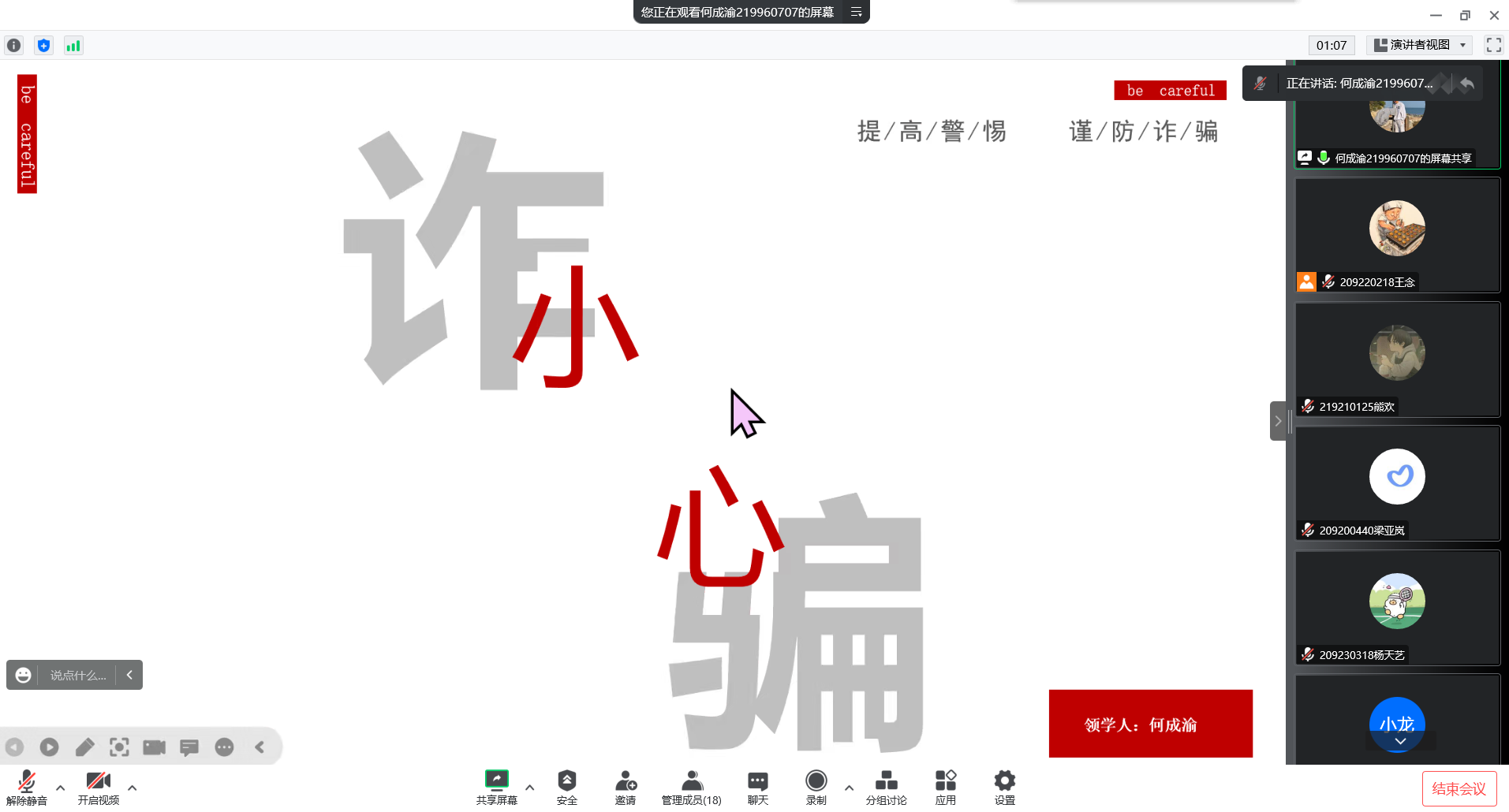 何成渝同志介绍了诈骗的特点,三种常见诈骗手段,从实例列举了几种诈骗骗局,分析高校大学生受骗上当的主要是因为思想单纯、防范意识较差、贪图虚荣、遇事不够理智、交友行事轻率,急功近利等原因。大学生要提高防范意识,学会自我保护,详细介绍如何预防诈骗。学习结束后全体同学结合本次学习内容交流心得,分享个人预防诈骗的方法、经验。
