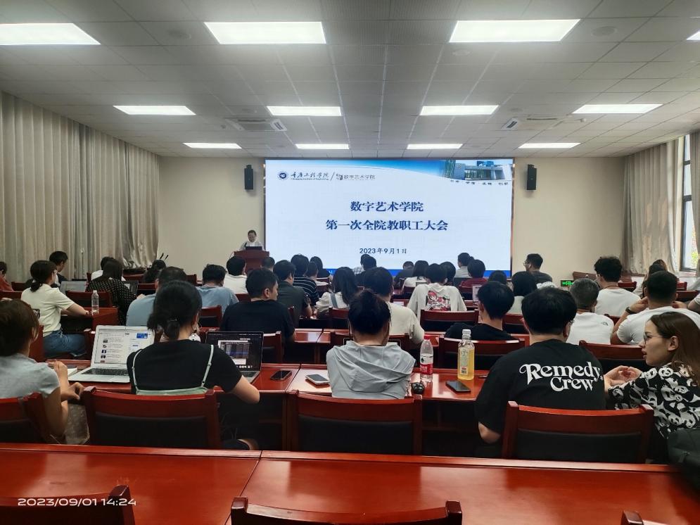 本网讯(文/图 综合办公室胡娟)2023年9月1日下午,数字艺术学院在行政楼第四会议室召开2023-2024学年第二学期新学期教职工大会。会议由学院办公室李毅主持,院长杨开富出席会议并发表重要讲话,学院全体教职工参加。